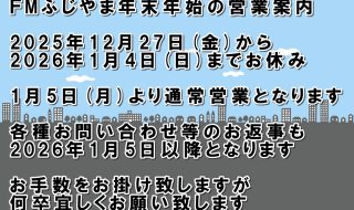 *期間内は「GoodMorningふじやま」「ふじやまワールドミュージック」はお休みです(再放送を含む) ラジオ町長室 2025年12月29日12:00~(再放送:2025年12月…詳細を見るFMふじやま2025~2026年末年始 営業案内